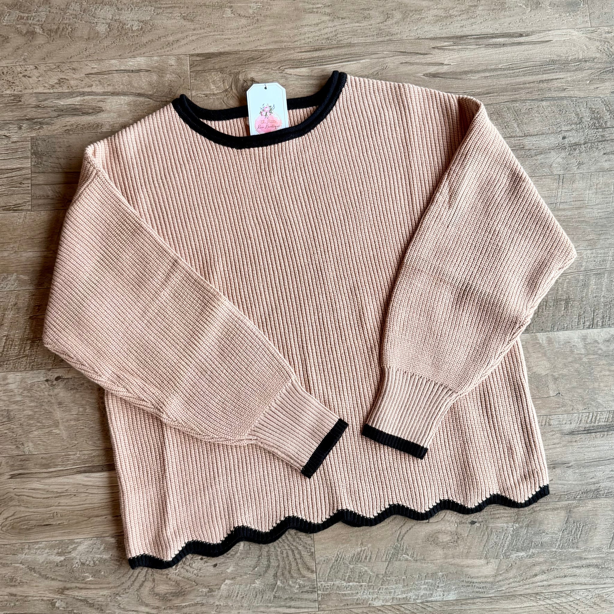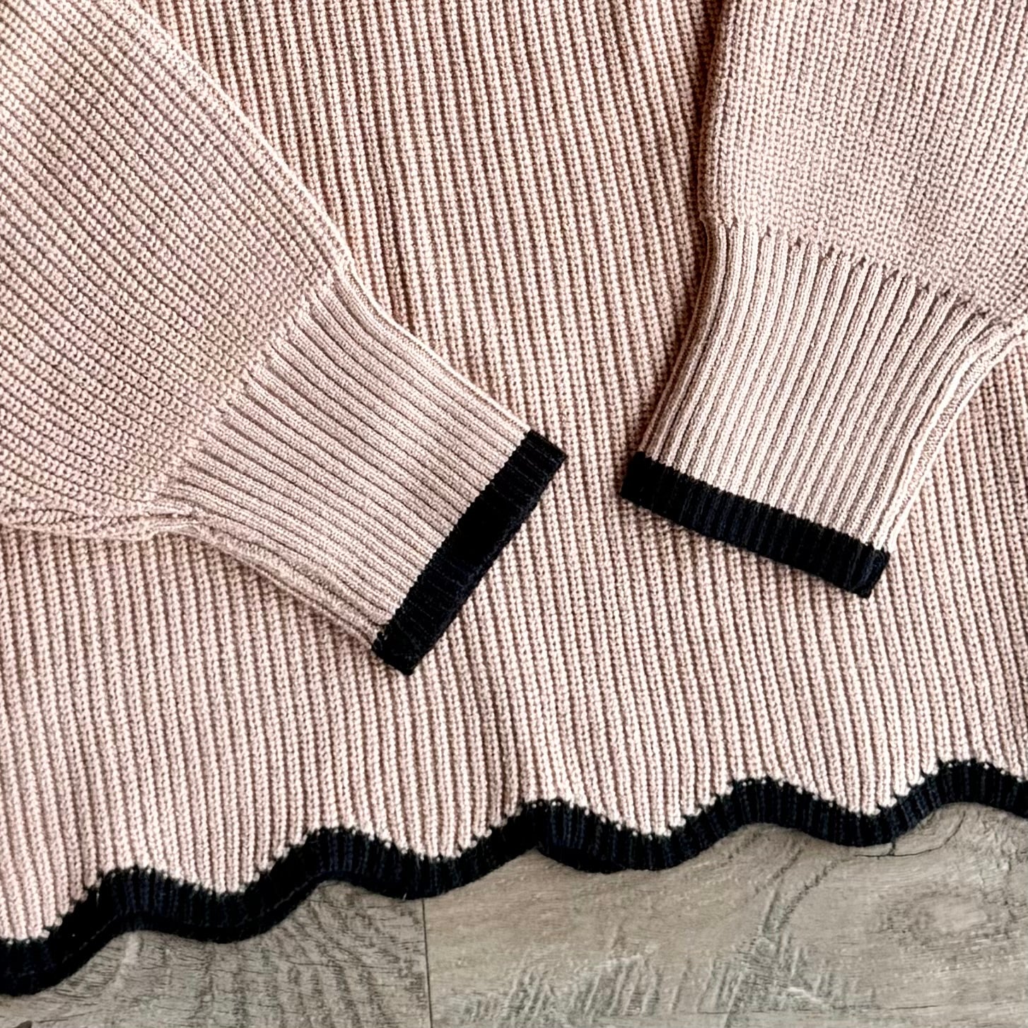 Features: A knit contrast sweater with a rounded neckline and scallop trim
