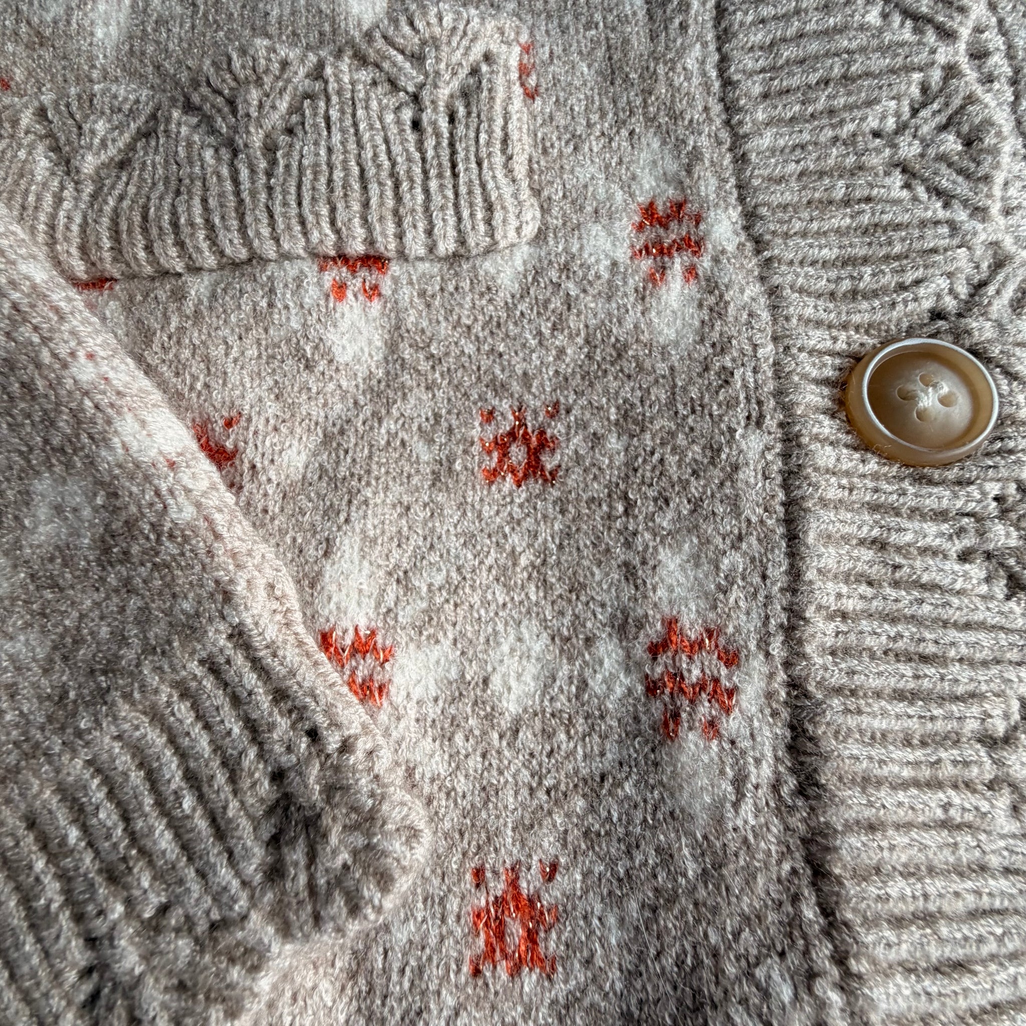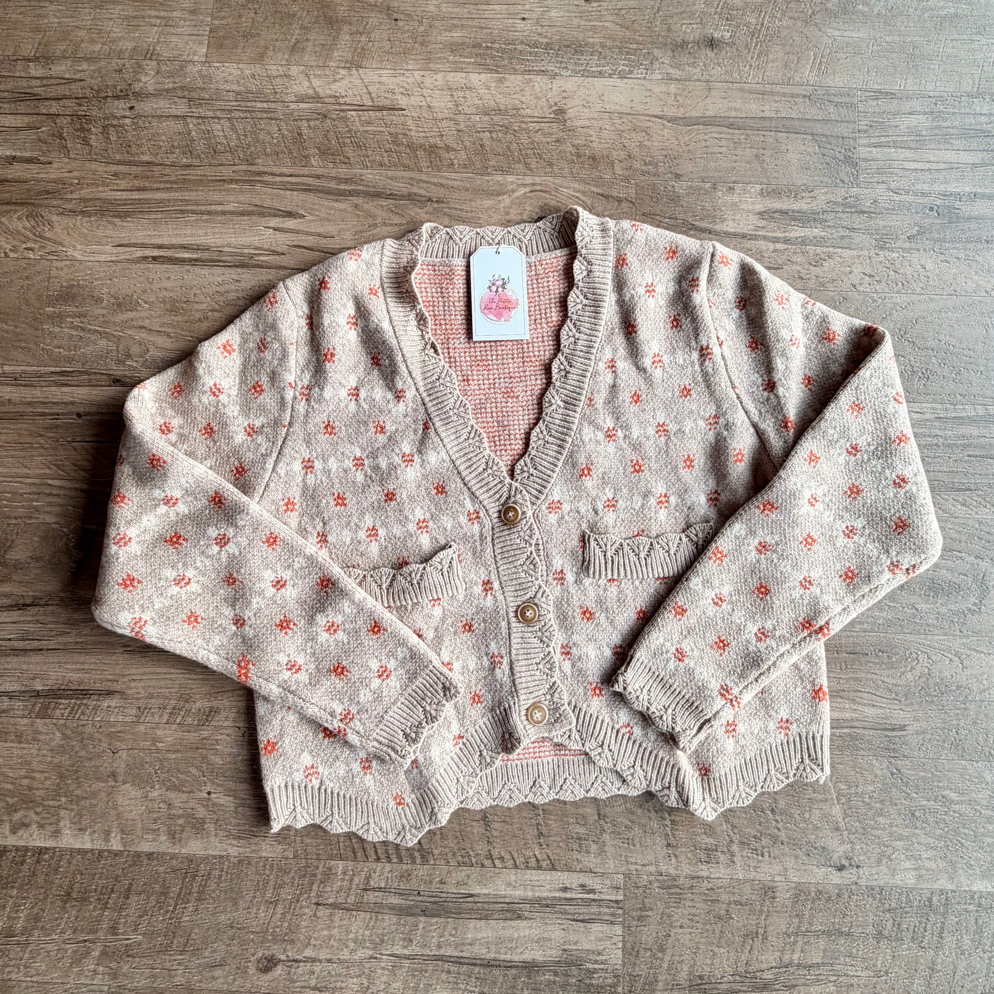 Features: A knit floral cardigan with pocket accents and a scalloped hem