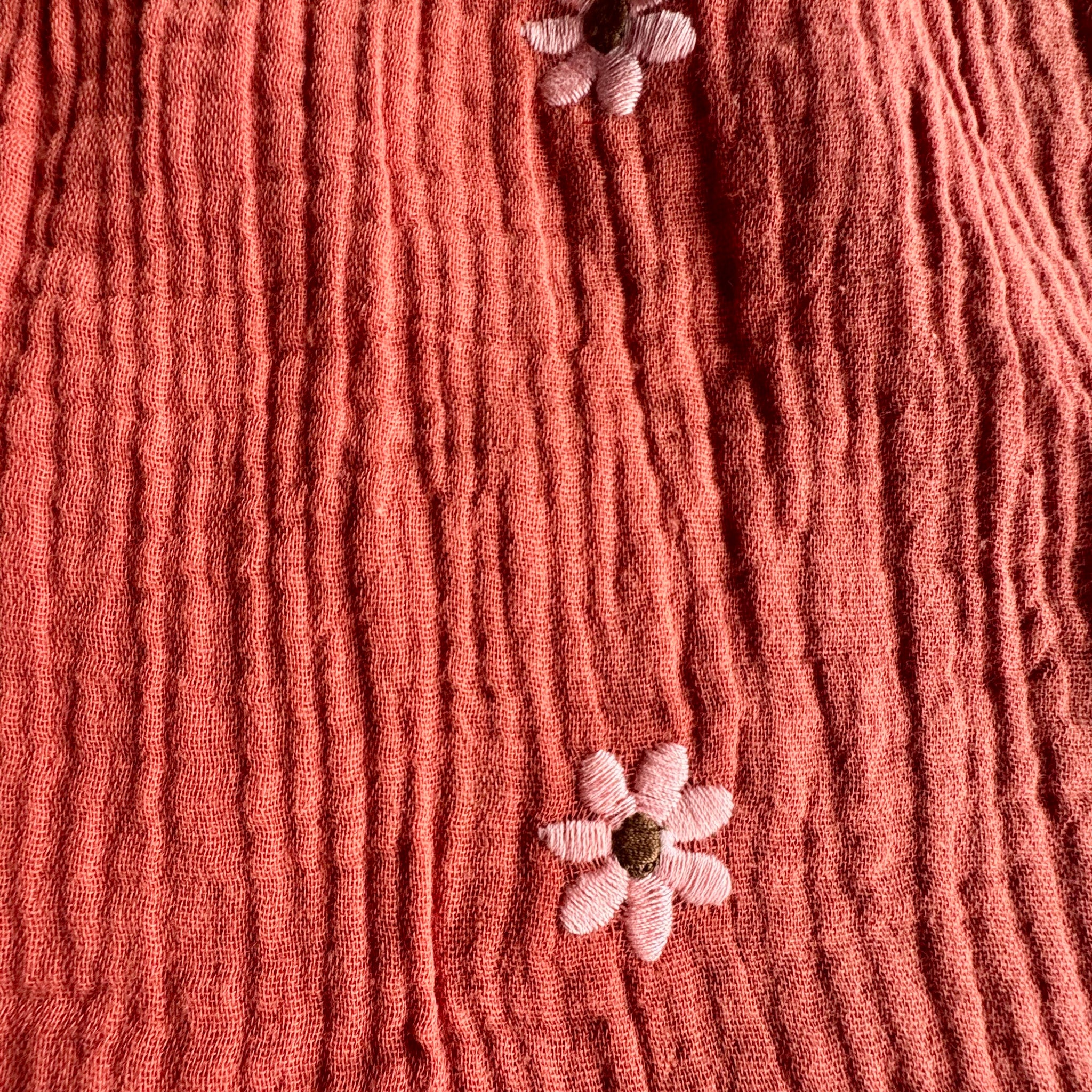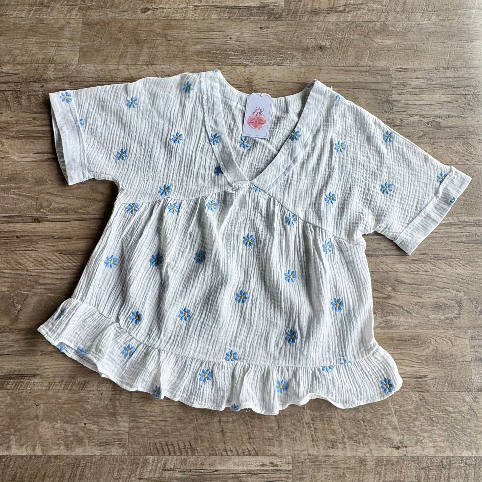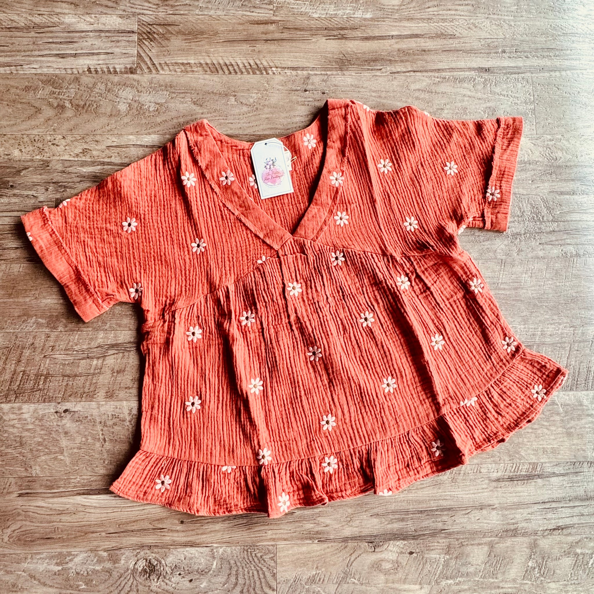Features: A woven short sleeve floral embroidered flowy babydoll top with a v neckline, raw edge, and ruffled hem detail